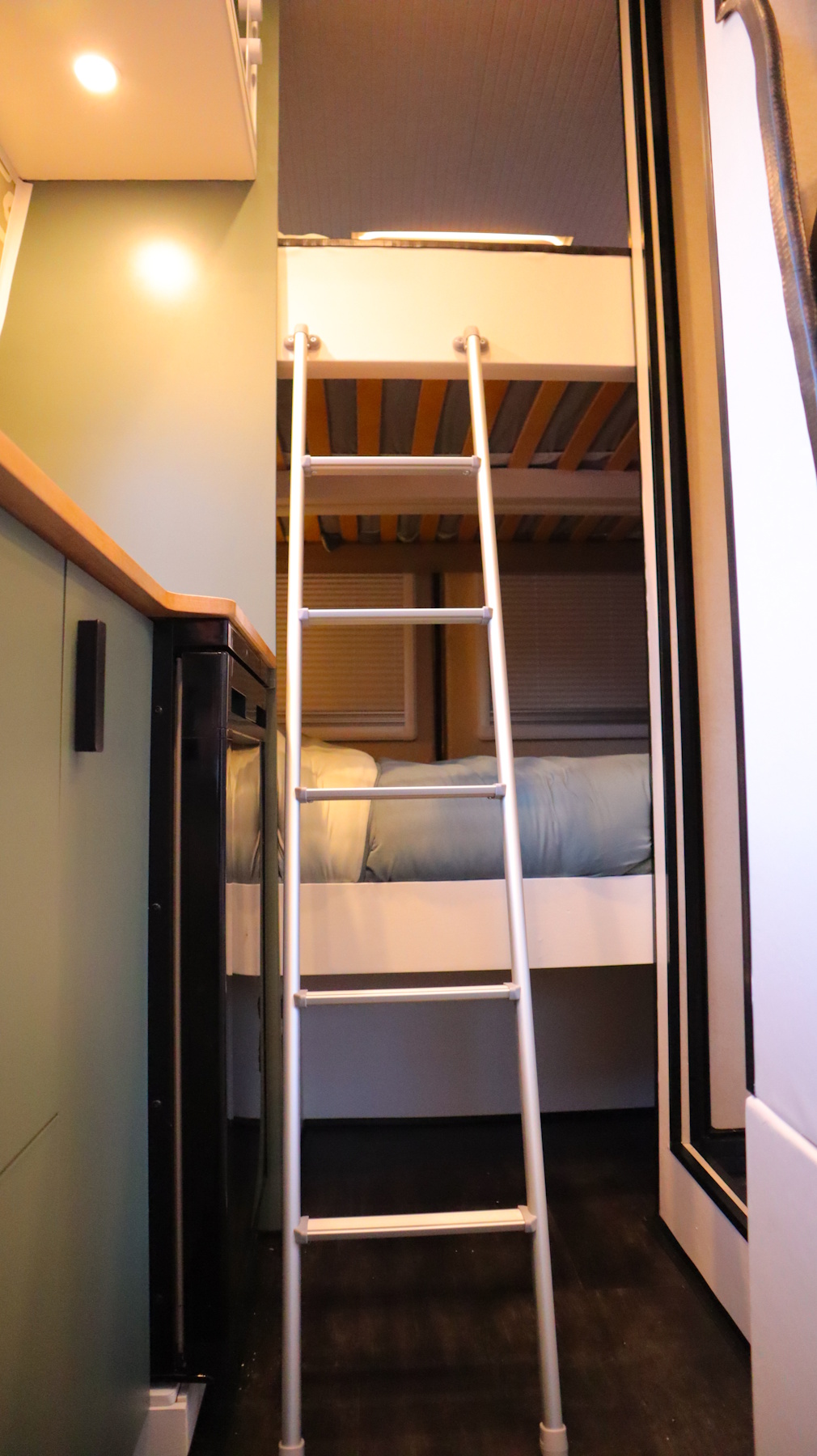 Slapen kun je met het hele gezin in onze buscamper, want er is een 2 x 2 persoons ruim stapelbed. Het onderbed is voor volwassen en het bovenbed voor de kinderen. Er is genoeg hoogte tussen de bedden en het plafond, zodat je comfortabel kunt slapen. De bedden kunnen beiden ingeschoven worden, waardoor er een zitje ontstaat. De verhuur is exclusief bedden/linnengoed.